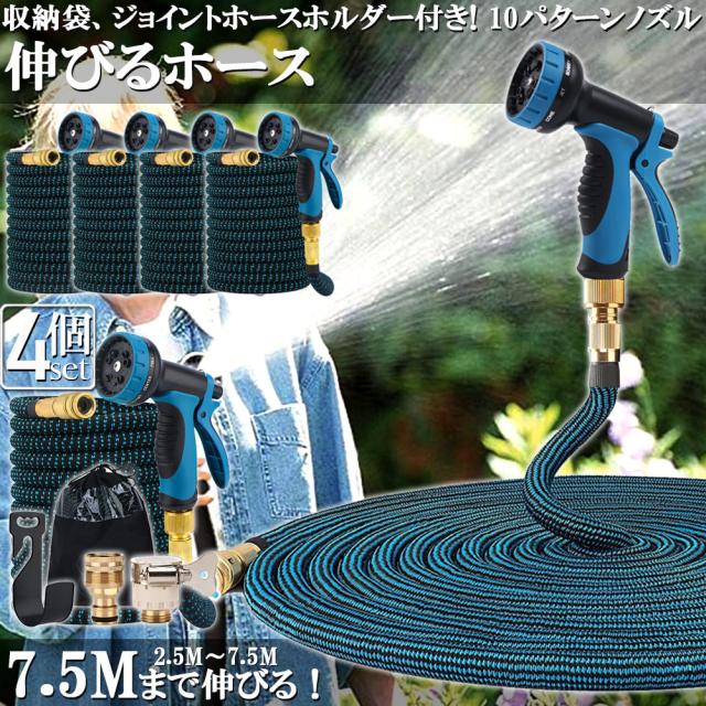 ホース 散水ホース 伸びるホース 4個セット ホースリール 伸縮ホース 洗車ホース 3倍に伸びる 10パターンノズル 超軽量 伸びるホースノズル 散水ノズル コンパクト収納 洗車 ガーデニング 庭 ベランダ 玄関 散水 大掃除 収納袋 付き