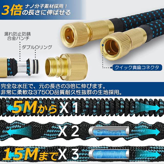 【3倍に伸びる】:収納時5m、最大15m、ホースを蛇口に取り付けてると、5mから15mまでホースが水圧で約3倍に伸びる便利なホース。(水圧によって最大限まで伸びれない場合があります)【超軽量素材】:使用しない時は、ホースの重量はわずか900gです。従来のゴムホースのような面倒くさい収納法に対し、伸縮ホースは超軽量素材を利用して全然重くないですから、誰でも楽にご収納いただけます。