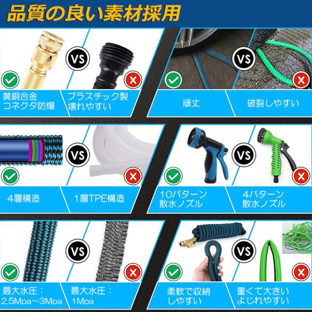 【長くご使用いただけます】:ホースの外管は丈夫な3750D高品質ポリエステル生地から作られますので、ホースを引き伸ばしても、鋭く尖った物に接触しても破損しにくいです。また、ホースの内管は業界で厚い4層ラテックス素材を利用し、耐久性が高いとなっています。