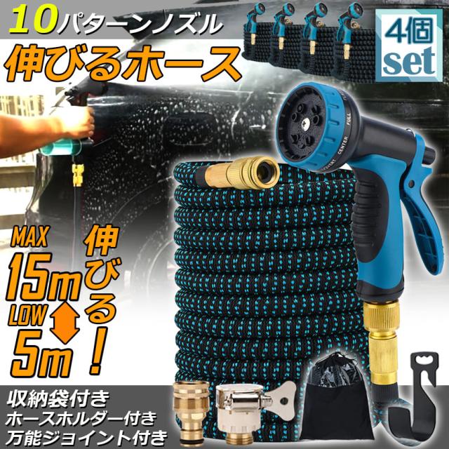 ホース 散水ホース 伸びるホース 4個セット ホースリール 伸縮ホース 洗車ホース 15M 3倍に伸びる 10パターンノズル 超軽量 伸びるホースノズル 散水ノズル コンパクト収納 洗車 ガーデニング 庭 ベランダ 玄関 散水 大掃除 収納袋 付き