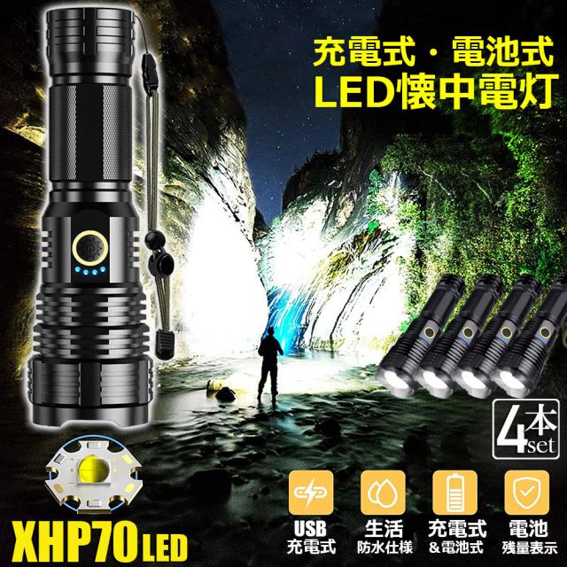 懐中電灯 XHP70 強力 防水 4個セット USB充電式 電池式 LCD残量表示 ズーム機能 5モード調光 TYPE-C入力 ledライト フラッシュライト かいちゅうでんとう led 明るい ハンディライト 登山用品 防災 停電対策 夜釣り SOS ラ