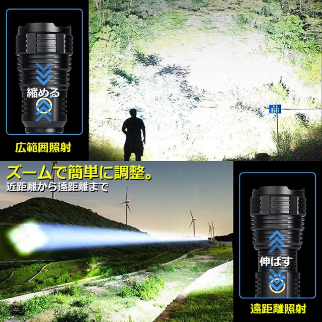 【超高輝度LED懐中電灯/ストラップ付き】LED懐中電灯は新世代のXHP70.2ランプビーズを採用し、普通のT6 ledチップより約5倍進化し、照射距離最大約500メートル、点光源テスト1500ルーメン、射線光源10000ルーメン+ /平方フィートです。停電時に天井に光を当てると、部屋全体を簡単に照らすことができ、明るくて遠くまで照射可能です。大人の手のひら程度のコンパクトなデザインは片手で簡単に操作できます。ストラップが付いており、使用時に落下する心配はありません、持ち運びに非常に便利です。【ズーム機能搭載/5つの照明モード】ズーム機能を搭載しており、ヘッド部分を伸縮させるだけで、広範囲照射モードと遠距離照射モードの切り替えが可能です。遠距離照射モードは最大照射距離が500m、180度広範囲照射モードは暗室全体を簡単に照射できます。5つの点灯モードを搭載し、照明ボタンを押すだけで簡単に高輝度→中輝度→低輝度→点滅→SOS→OFFを切り替えできます。更に、どのモードでも、スイッチを2秒間長押しすると消灯できます。操作が簡単で便利です。