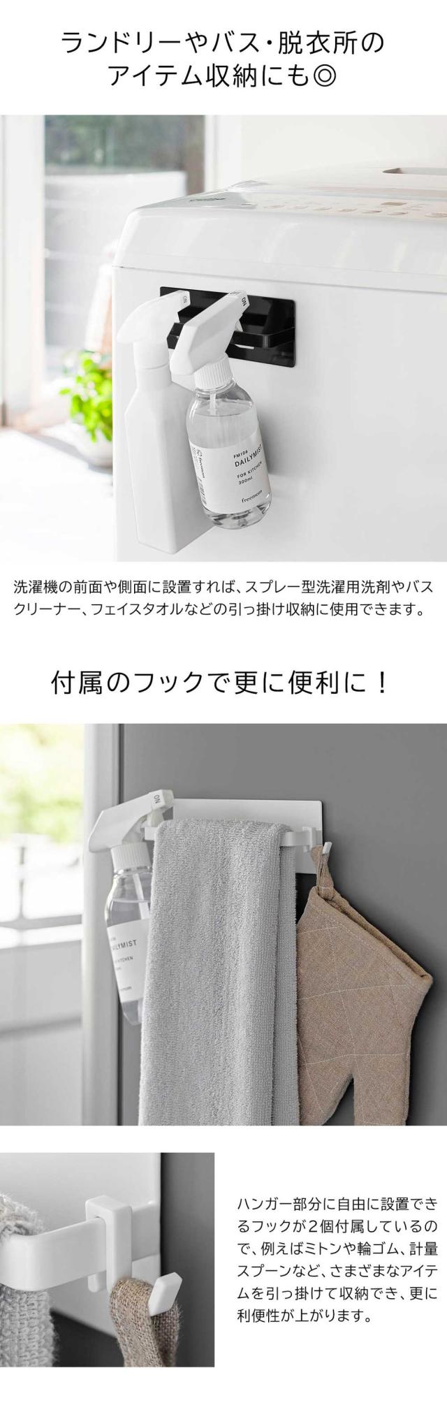 マグネットのつくキッチンパネルや冷蔵庫、洗濯機にペタッと貼り付けるだけで設置できるタオルハンガー。キッチンでは布巾をはじめアルコールやクリーナーなどのスプレー類、ランドリールームや脱衣所では、洗濯用洗剤やバスクリーナー、フェイスタオルなどを掛けられて便利です。