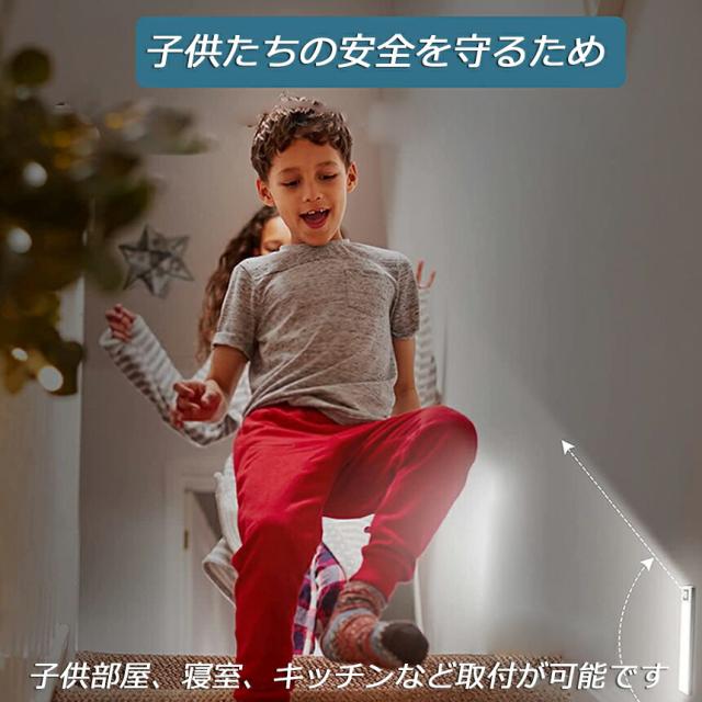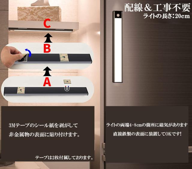 【取り付けが簡単&マグネット式】方法1、センサーライトの両端には強力マグネットが付き、金属表面(冷蔵庫のドアなど)に直接吸着できます。方法2、パッケージ内の2枚の金属テープを取り付けたい場所に貼り付けてから、灯体を金属テープに直接吸着できます。マグネットとライト本体は分離可能。お手軽い階段・寝室・廊下・玄関・キッチン・ガレージ・倉庫・戸棚などご装置したい場所に貼り付けできます。