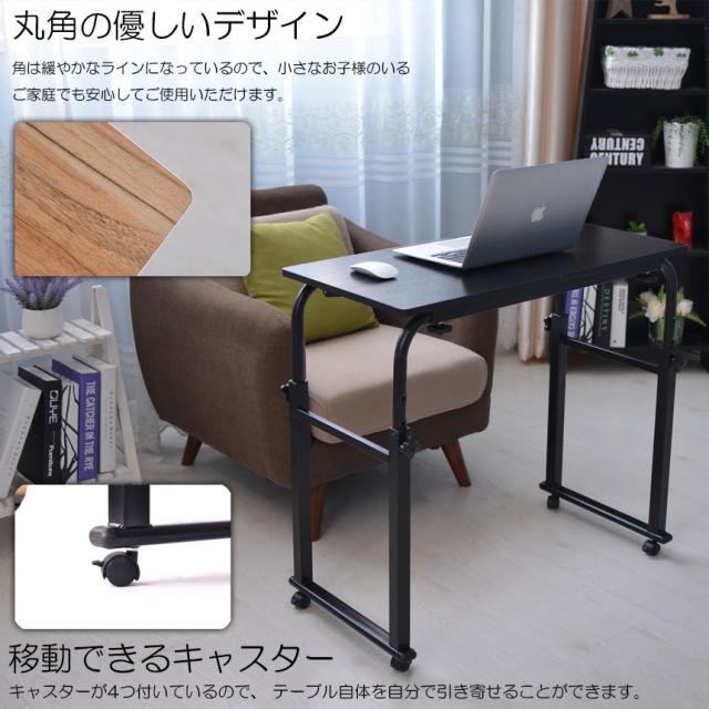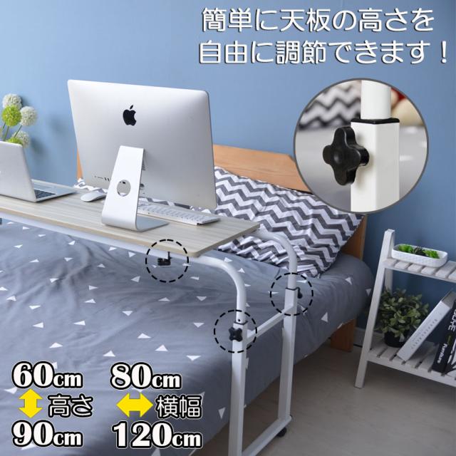 【調節可能ベッドテーブル】ベッドサイズに合わせて横幅・高さを調節可能な伸縮ベッドテーブル。幅80〜120×奥行40×高さ60〜90cm、天板サイズ:約幅80×奥行40×高さ1.6cmサイドについているストッパーを調節することで高さ調節が可能に。【キャスター付き】キャスターが4つ付いているので、テーブル自体を自分で引き寄せることができます。