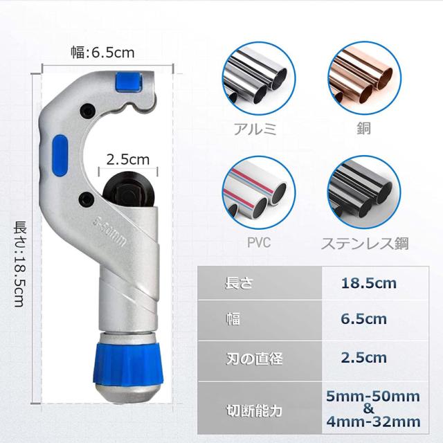 切断能力(パイプ直径):φ4~32mm φ5~50mm 2タイプ選べる切断能力(パイプ肉厚):3mm迄(ただし、ステンレス鋼管は2mm迄)