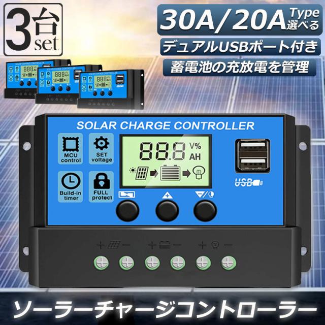 ソーラーチャージ コントローラー 3台セット 20A 30A 12V 24V 鉛蓄電池車バッテリー充電コントローラー USBポート 付き LCD液晶表示 ソーラーパネル 太陽光パネル 接続用 過充電 過負荷 防止保護