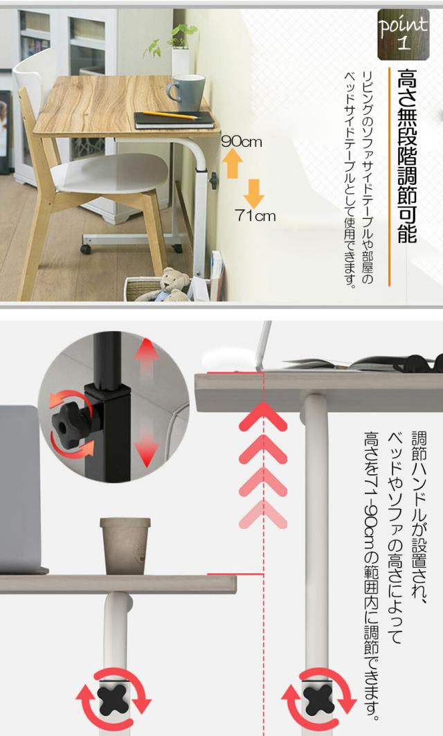 【使いやすい】ソファの下またはベッドの上、ソファやベッドの下に置くのが簡単で、非常に快適な姿勢で過ごせます。【高さ調節可能】調節可能/簡単な移動、調節可能な高さ71-90cm、滑らかキャスターでデスクを好きな場所に移動できます