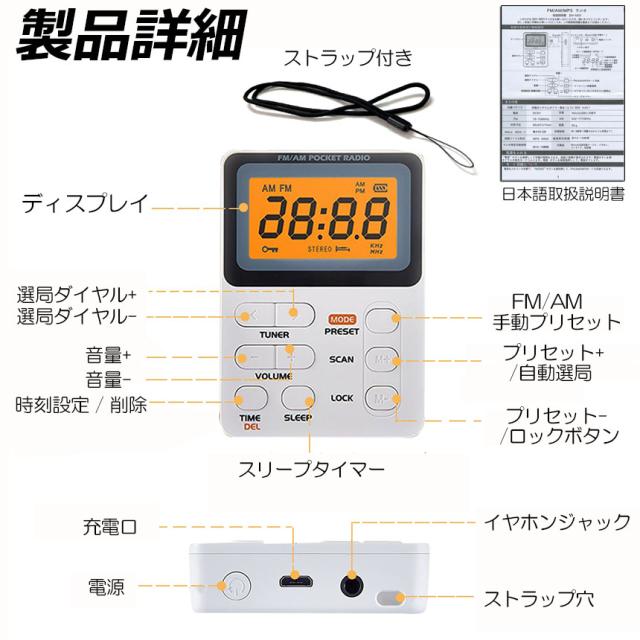 【ポケットラジオ】:コンタクトなサイズ、イヤホーン付属、電車などの公共場所に適用するポータブルラジオです。簡潔なデザイン、余計な機能がない分ボタンがシンプル、LCD大画面つきで非常に見やすいです。 コンパクなのでバッグの中に入れたままでもブラインド操作が容易。ご注意:ラジオの信号は場所によって、信号の強弱性が違います。電源ボタンを長押しでオン/オフ切り替えます。(イヤホンがアンテナとなります)【DSP技術採用】:DSP技術を採用されたミニデジタルラジオは強大なデータ処理と高速運行、信号安定、高感度、受信強い、オーディオの伝送は失わない、fm&amラジオ、全週波数:FM:76-108MHZ AM:522-1710KHZ(9K)日本向け、522-1710KHZ(10K)海外向け。日本国内だけでなく、国外使用可能なラジオです。