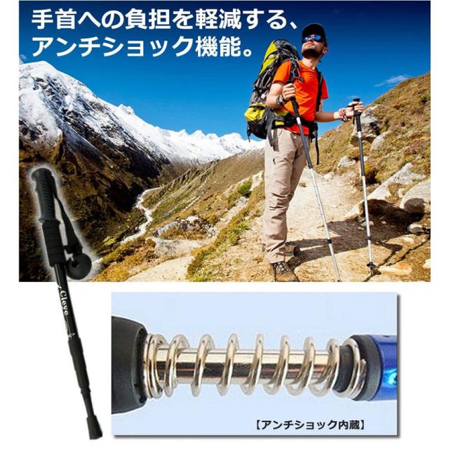 【アルミ製&超軽量】超軽量アルミニウム合金製のシャフトを採用。軽さと強さを兼ね備え 耐衝撃性に優れた素材です。製品の重量は1本わずか約350g、長時間のトレッキングでも 疲れません。【アンチショック】スプリングが内蔵された衝撃吸収システムは肩、ヒジ、手首への衝撃を25〜30%軽減してくれるので、手首の痛みを緩和してくれる働きがあります。険しい道では役立つのでハードな登山に最適です。