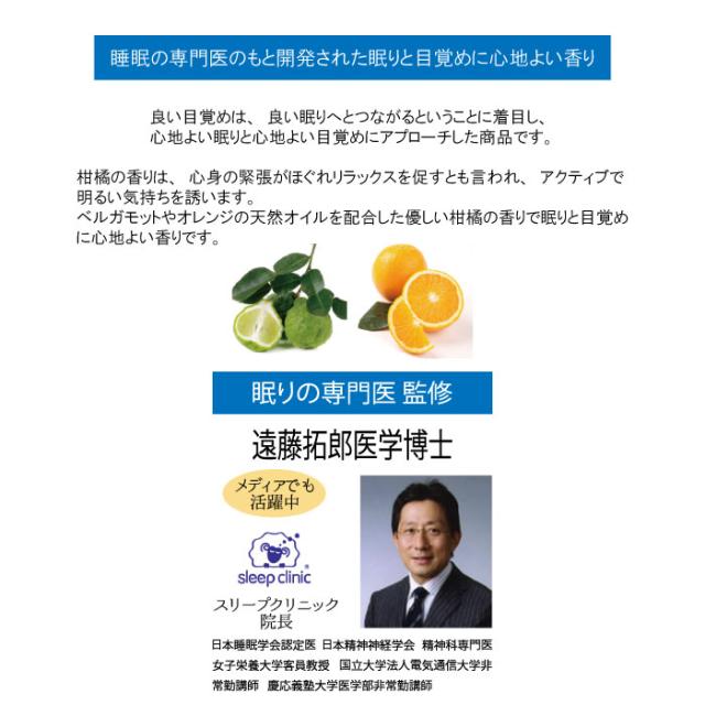 | 商品説明 | ・ベルガモットやオレンジの天然オイルを配合したやさしい柑橘の香りです。 ・枕やシーツ、カーテンなどリネンやファブリックに20〜30cm離して、2,3回スプレーしてください。 ・寝室には、換気後にお好みで空気中に4,5回スプレーしてください。眠りと目覚めに心地よい香りです。 ・睡眠の専門医であるDr.遠藤のもと開発されました。 |