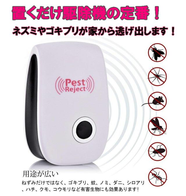 商品詳細: 超音波式のねずみ・害虫駆除機です。ネズミやゴキブリだけでなく、蚊、蟻、蜘蛛、ノミ、ダニ、シロアリ、コウモリなどの有害生物にも対応! 部屋のコンセントにさしておくだけです。ネズミや虫の嫌がる超音波を出します。2〜3週間連続使用していただければいなくなります。