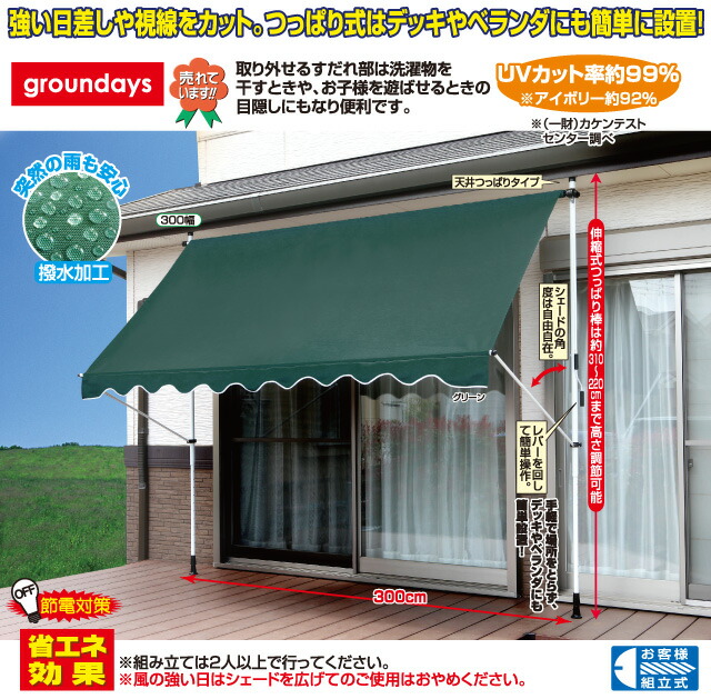 商品詳細: 強い日差しや視線をカットする日よけシェード。つっぱり式でデッキやベランダに簡単設置!マジックテープで着脱できる前幕は洗濯物を干すときや、お子様を遊ばせるときの目隠しにもなり便利です。
