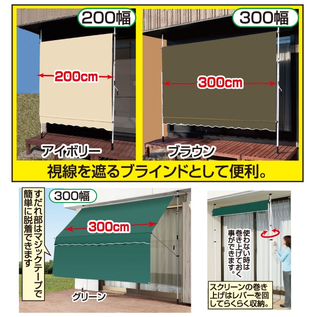 サイズ: 約幅200×高さ220〜310cm(つっぱり式)、スクリーン:約幅186.5×長さ200cm(最大)、すだれ:約幅186.5×長さ98cm