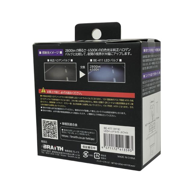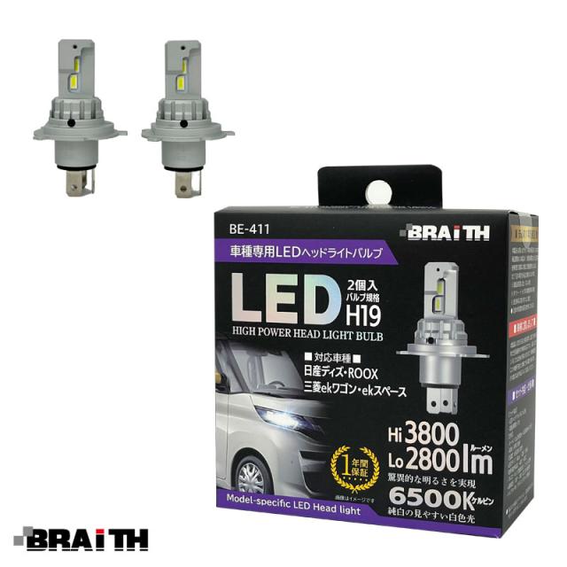 BRAiTH/ブレイス 車種専用LED ヘッドライトバルブ H19 2個入 6500K 2800lm ホワイト デイズ/ROOX ekワゴン/ekスペース 専用設計 BE-411
