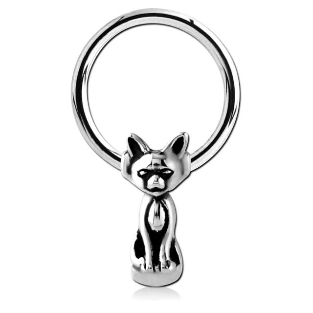 14ゲージのキャプティブビーズリングに座った猫のキャッチをセットしたボディピアス。