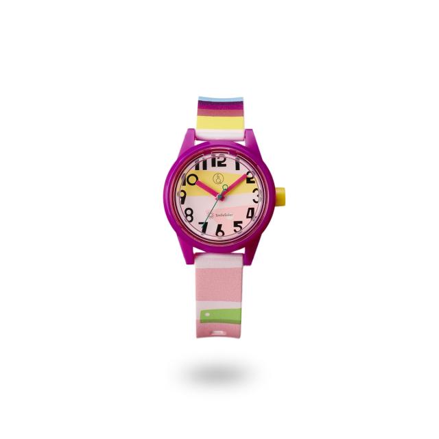 スタンダードな柄の中に潜むユニークな表現に、こころが弾むこと間違いなしです。文字板の数字は、お子さまでも分かりやすいよう、視認性を重視しながらも楽しげなデザインに仕上げました。