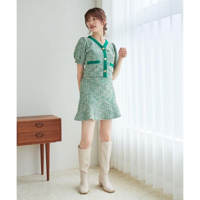 同素材で仕立てた1037048401 カットツイードミニスカパンとのセットアップコーデが一押し。