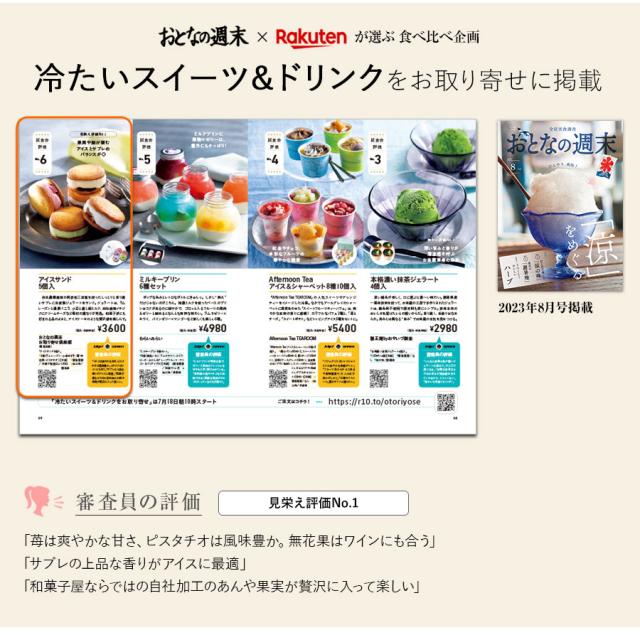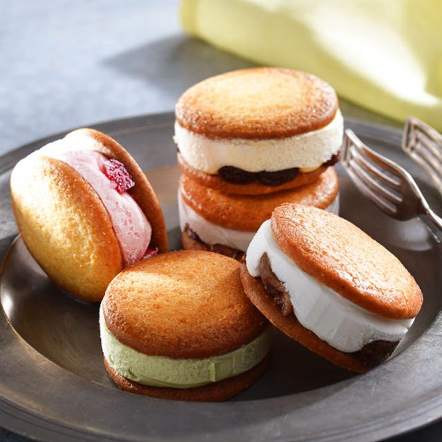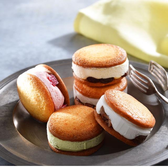 自社農園栽培の阿波和三盆糖を使ったしっとりと香り高いサブレに自家製ジェラートをサンド。ジェラートは、ラムレーズンと濃厚バニラ、小豆と漉し餡ミルク、自社栽培イチジクにクリームチーズなど素材の重なりが秀逸。和菓子派にも好まれる品のよさと、アイスケーキのような贅沢感を楽しんで。