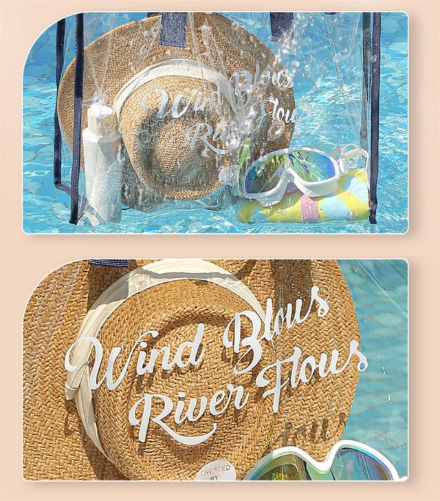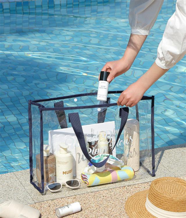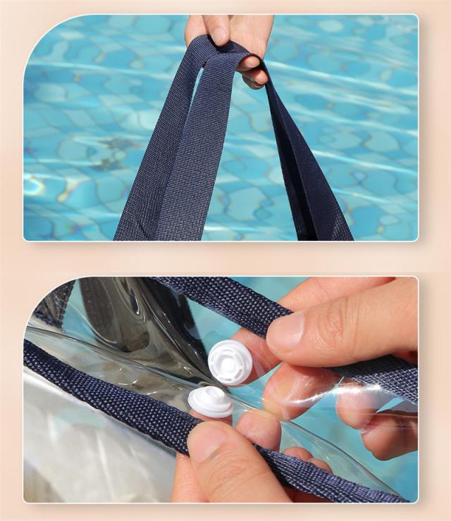 撥水性があって水に濡れても安心な透明PVCビニール製で、水や汚れに強く丈夫なクリア素材バッグは、砂やお水など軽く払えば出てきます。