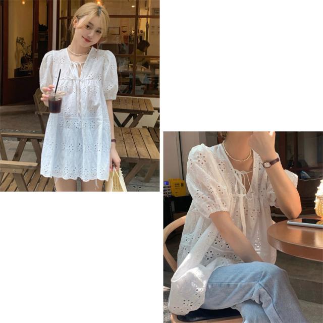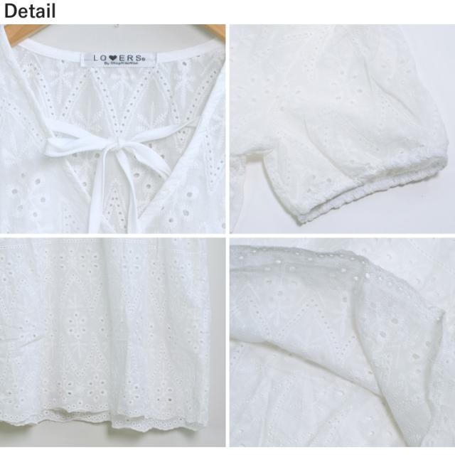 全品送料無料一部除く Vネック レース刺繍 チュニックブラウス ma 【即納】 トップス ブラウス 半袖 チュニック ミニワンピース パフスリーブ アイレットレース パンチングレース リボン レディース 韓国 プチプラ 流行り トレンド 人気 おすすめ おしゃれ