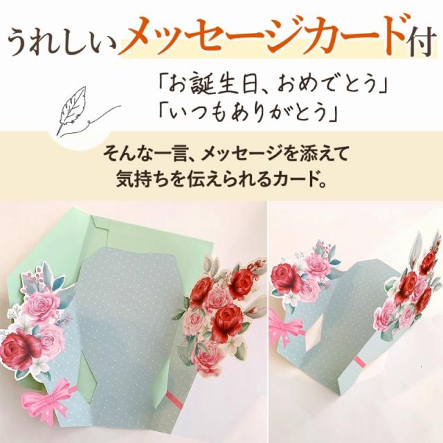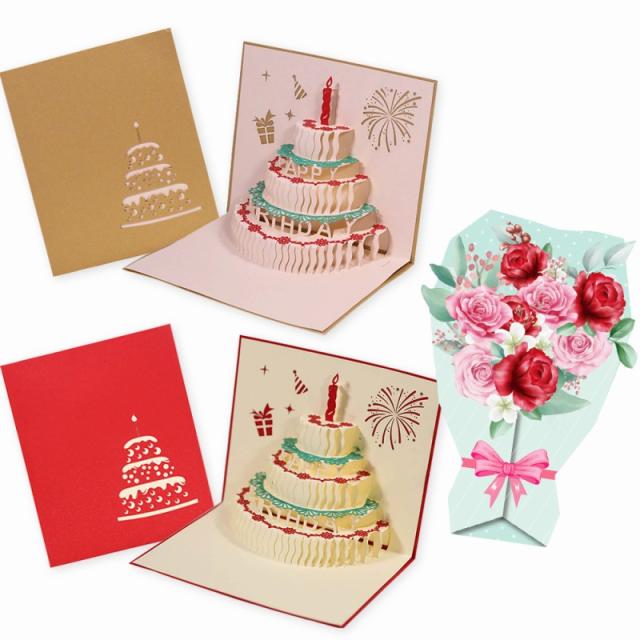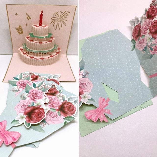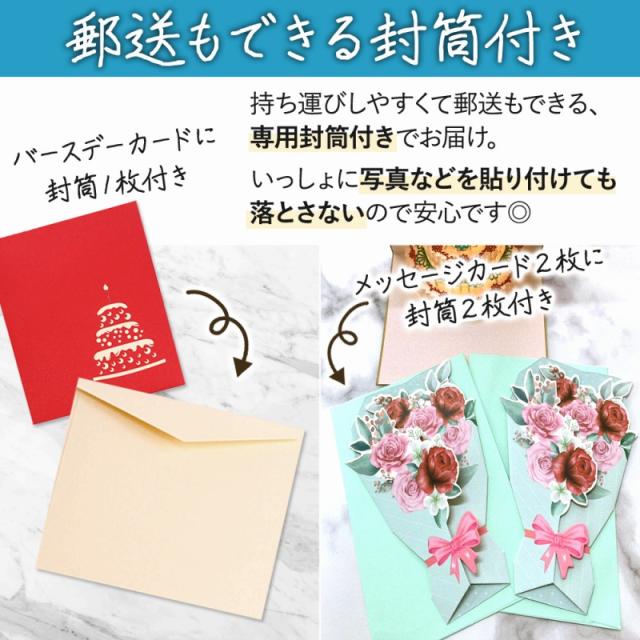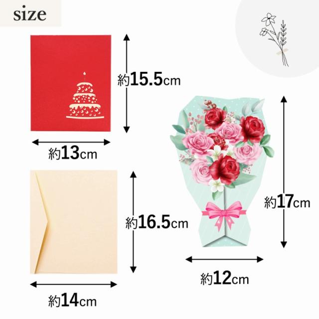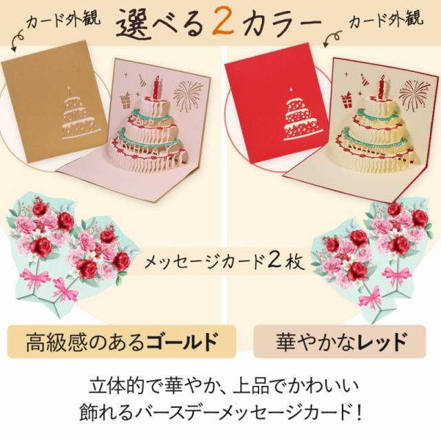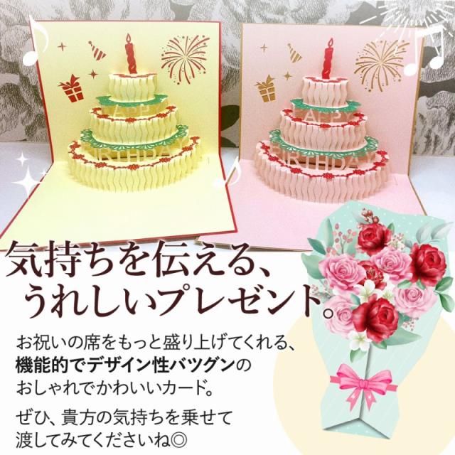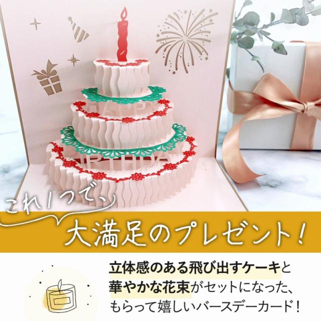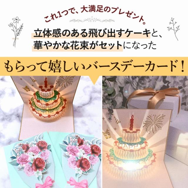 立体感のある飛び出すケーキと華やかな花束がセットになった、もらって嬉しいバースデーカード!
