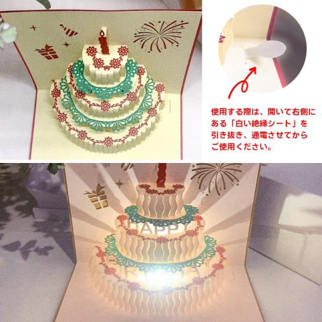 ※バースデーカードをひらくと、ハッピーバースデーの曲が電子音で流れ、ケーキがライトアップされます。