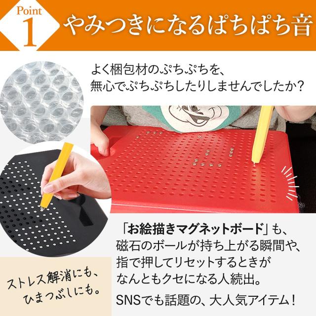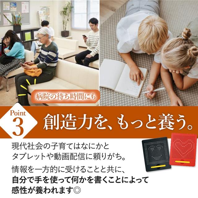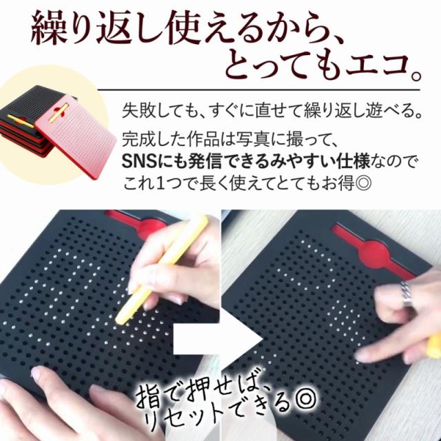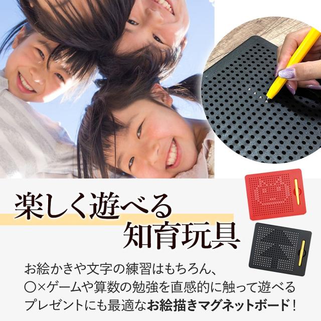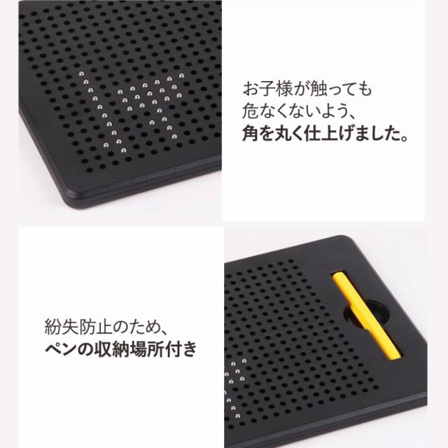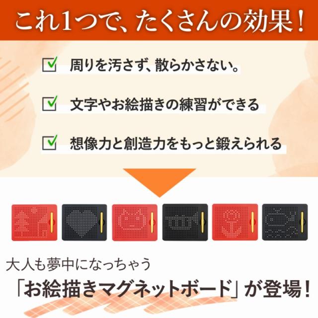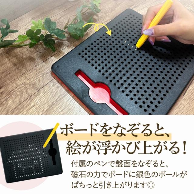 | 商品の説明 | ボードをなぞると、絵が浮かび上がる! 付属のペンで盤面をなぞると、磁石の力でボードに銀色のボールがぱちっと引き上がります◎ ゴミがでないから、片付け簡単! 細かなパーツが飛び散らず、なくなることもないので誤飲の心配がない安心玩具。 コンパクトなので、お出かけにも最適! 現代社会の子育てはなにかと タブレットや動画配信に頼りがち。 情報を一方的に受けるだけでなく、自分で手を使って何かを書くことによって感性が養われます◎ 描けるものいろいろ大好きなキャラを描いたり、数字や文字を描いたり。 オリジナルはもちろん、どれだけはやくお手本通りに再現できるかの遊びもできます◎ 危なくないよう、角を丸く仕上げました。 紛失防止のため、ペンの収納場所付き 繰り返し使えるからとってもエコ。 失敗しても、すぐに直せて繰り返し遊べる。 完成した作品は写真に撮って、SNSにも発信できるみやすい仕様なのでこれ1つで長く使えてとてもお得◎ |