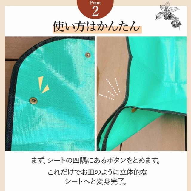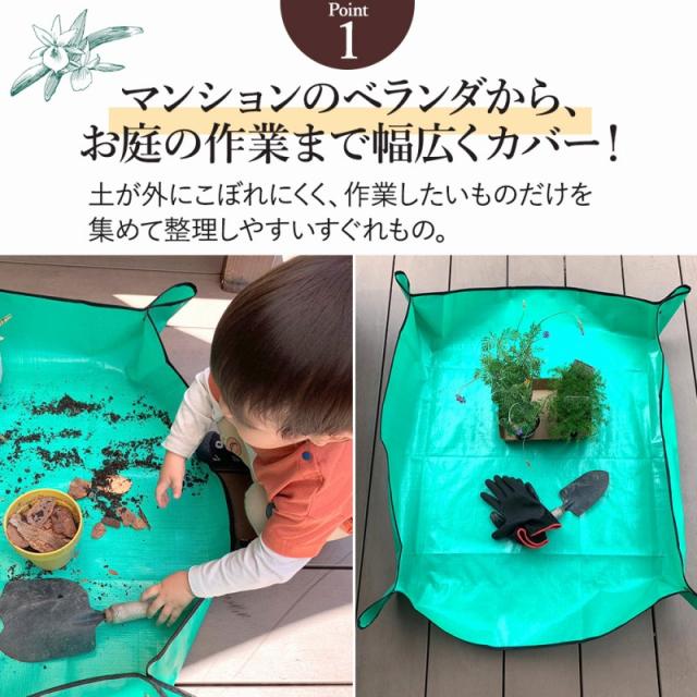 | 商品の説明 | マンションのベランダから、お庭の作業まで幅広くカバー! 土が外にこぼれにくく、作業したいものだけをあつめて整理しやすいすぐれもの。 使い方はかんたん。 まず、シートの四隅にあるボタンをとめます。 これだけでお皿のように立体的なマットへと変身完了。 広範囲で作業可能! 植木鉢の土を全部ひっくりかえして肥料を混ぜ合わせたり石と土をふるい分けたり。 まんべんなく混ぜ合わせて広く場所を使えるので、やりやすい環境に◎ 使い終わったら、お皿を片付けるように持ち上げてまとめられます。 面倒なほうきで掃き掃除もしなくてOK。 耐水性があるので、土や泥がついてしまったら 流水でさっときれいにできるのもうれしいポイント! 細かなパーツが多い組み立てや防水と耐久性を活かして 海やキャンプなどでレジャーシートにも。 マルチに使えて、コンパクト。 これからの季節、大活躍する優れもの! 室内屋外アウトドア今大人気の「ガーデニングシート」ぜひ使ってみてくださいね◎ |