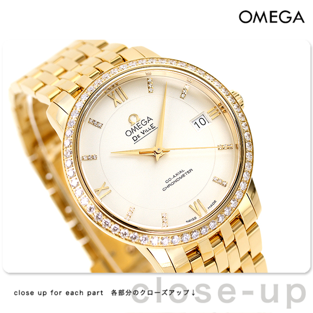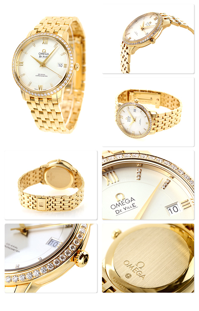 5年保証キャンペーン オメガ デビル コーアクシャル クロノメーター 36.8mm 18金 ダイヤモンド スイス製 メンズ 腕時計 424.55.37.20.52.002 OMEGA DE VILLE PRESTIGE アナログ シルバー イエローゴールド ◆オメガは1848年、ルイ・ブランによってスイスにて設立された高級腕時計ブランドです。1894年に発表した懐中時計のムーブメント、「Ω(オメガ/達成と極致の意)」という言葉を正式な社名として採用しました。 「オメガ デ・ヴィル プレステージ」コレクションは、そのクラシカルでエレガントなデザインが、多くのオメガ愛好家を惹きつけています。豪華な仕上げとタイムレスなデザインを備えたシンプルなスタイルが特徴です。2つのゾーンに分かれた印象的なシルバーのダイアルには、ダイヤモンドがセットされたインデックスと3時、6時、9時、12時位置にローマ数字、3時位置に日付窓が付属しており、傷の付きにくいサファイア・クリスタル ガラスで保護されています。 機械式腕時計