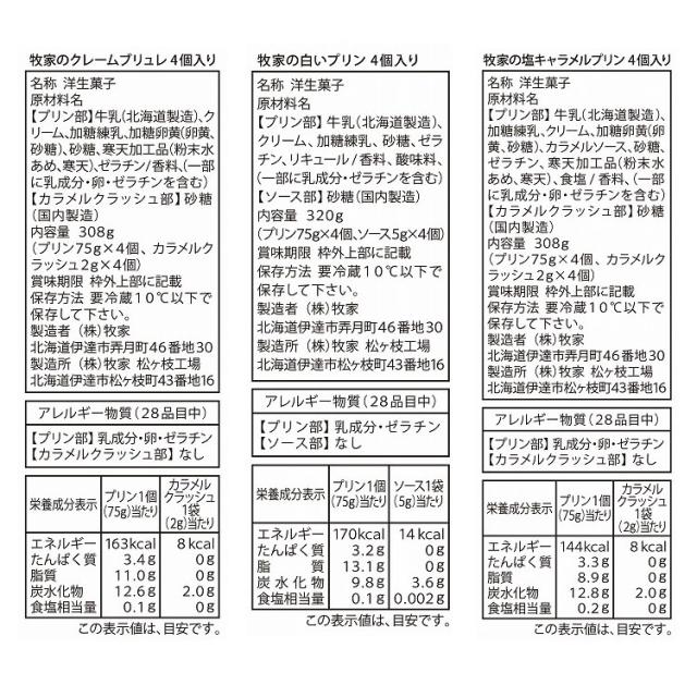 ■規格:牧家の白いプリン4個入×1・牧家のクレームブリュレ4個入×1・牧家の塩キャラメルプリン4個入×1