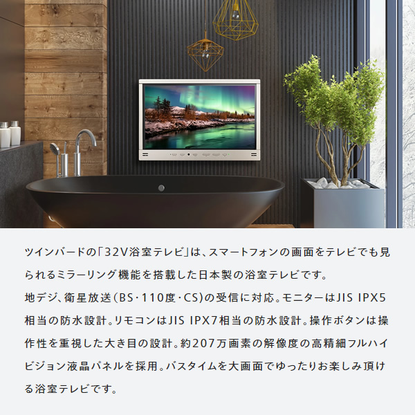 ツインバードの「32V型浴室テレビ」は、 スマートフォンの画面をテレビでも見られる ミラーリング機能を搭載した日本製の浴室テレビです。 ■製品寸法 [ W x D x H ] モニター:約 777 × 50 × 520 mm( ケーブル・コネクタ含まず ) 電源ボックス:約 140 × 220 × 74 mm( 突起部含まず ) リモコン:約 50 × 150 × 22 mm( ホルダー含まず ) ■製品質量 モニター:約 11.1 kg( 据付板含まず ) 電源ボックス:約 1.2 kg リモコン:約 85 g( 電池含まず ) ■画面サイズ 32V型 ■セット内容 mini B-CASカード( 赤 ) 電源ボックス リモコン 単 4 電池( リモコン用 )2本 リモコンホルダー 両面テープ( リモコンホルダー用 ) 電源接続ケーブル アース線 アンテナケーブル 据付板 モニター固定ネジ 2本 モニター固定ネジ( 防犯用 )2本 据付板取付けネジ8本 F型中継接栓 取扱説明書( 保証書付 ) 工事説明書 ※記載は商品仕様の一部です。仕様説明不足等の理由での返品はできません。特に適合等は必ずご確認ください。