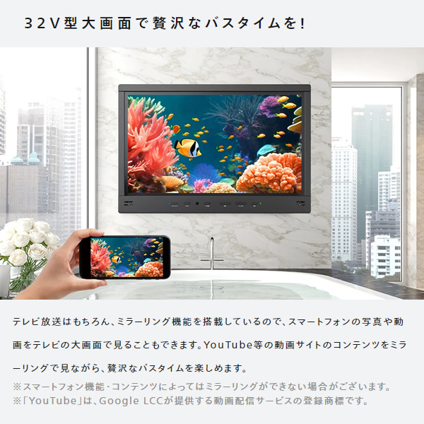 ミラーリング機能を搭載した日本製の浴室テレビです。