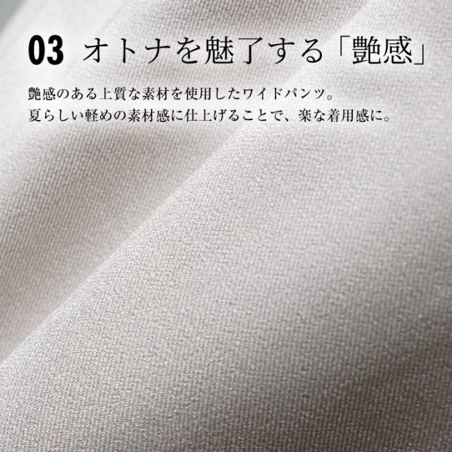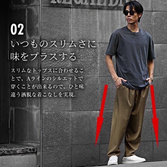 艶やかで程よく落ち感のある素材感が、ワイドなシルエットでもルーズになりすぎずに、上品さを演出。