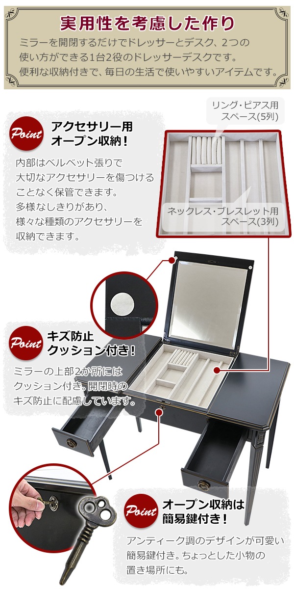 ロココ調 ドレッサー スツール セット 天板サイズ約W90×約D45cm ドレッサーデスク 収納 化粧台 鏡台 メイク台 鏡 ミラー 机 テーブル 木製 椅子 イス チェア 一面 1面 コスメ 小物 アンティーク インテリア 家具 リビング おしゃれ rococof10
