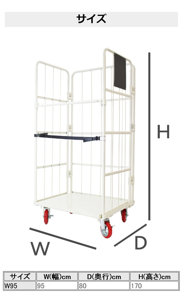 | 本体寸法(カゴ台車) | 約95(幅)x約80(奥行)x約170(高さ)(cm) |
