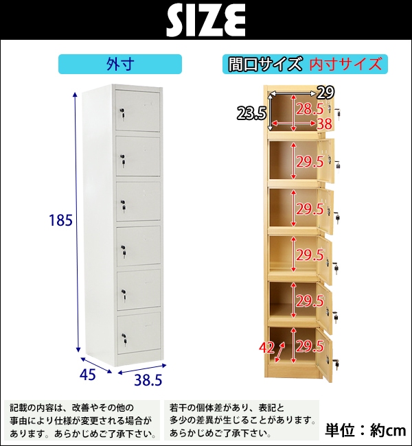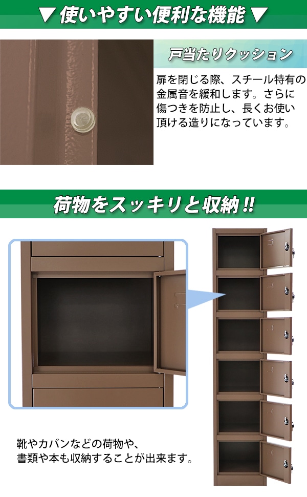 ■6人用のスチールロッカーです。 ■靴や手荷物、洋服等の収納に大変便利です。 ■鍵付きですべての扉を施錠可能! ■鍵は、12個(内スペアキー6個)付属しています。 ■物置、ロッカー、棚等、様々な用途でご使用いただけます。 ■粉体塗装を施し、キズや剥がれを防ぎ、錆びにくい仕様となっています。 ■材質・・・スチール[本体(スチール厚み・・約0.6mm)]、ステンレス[鍵穴]、亜鉛メッキ鋼[鍵]、プラスチック[鍵] ■重量・・・約23kg ■耐荷重・・・約30kg(ロッカー内底面) ■塗装・・・粉体塗装 ★組み立てについて★ 組み立て式です。(大人2名で組み立てられます。) こちらの商品は、ネジやビスなどを使用せず組み立てる事が出来、比較的簡単に組み立てられます。 組立てにくい場合には、マイナスドライバーをご用意下さい。 ●新品商品ではありますが、輸入商品の為、多少の擦り傷などがある場合がございますので、ご納得の上ご購入下さいませ。 ●ご購入後、お客様ご都合によるご返品、ご返金等は一切お受け致しておりません。 ●本商品を使用した際に発生したトラブル、事故につきまして、当社は一切の責任を負いません。ご使用に関しましては、全て自己責任にてお願い致します。 |