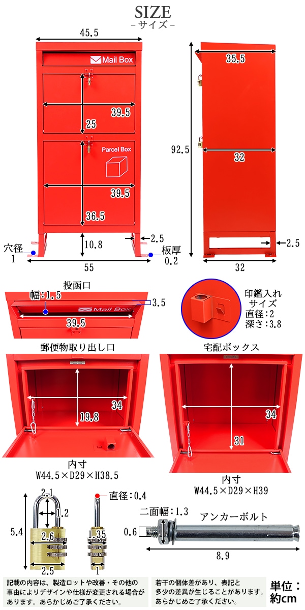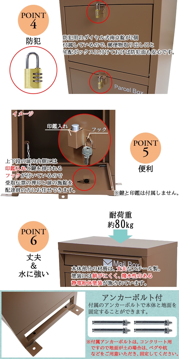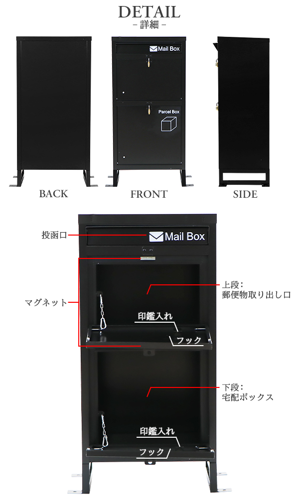 ●上部には郵便ポストも付いているスチール製の宅配ボックスです! ●上段の郵便物取り出し口は大きく開くので取り出しやすいです! ●下段は宅配ボックスになっており大きな荷物も余裕で入ります! ●ダイヤル式南京錠が2個付いているので防犯面も安心です。 ●配達されるのを待ったり、面倒な再配達ももうしなくていいんです。 ●子育てや介護、ご自宅でお仕事をされていて手が離せない方にも便利。 ●女性の方で配達員と顔を合わせない人にも。 ●上段下段の扉の内側には印鑑入れと鍵が掛けれるフックが付いています。 ●塗装には錆びにくく、撥水性のある静電粉体塗装が施されています。 ※こちらの商品は組立式です。 (組立にはドライバーが必要です。お客様にてご用意ください。) ■材質:スチール(本体)、南京錠/スチール[クロムメッキ仕上げ](シャックル)、真鍮[クロムメッキ仕上げ](ダイヤル)、真鍮[真鍮磨き仕上げ](本体) ■重量:約17.2kg ■耐荷重 天板:約80kg 上段:約60kg 下段:約60kg ●新品商品ではありますが、輸入商品の為、多少の擦り傷などがある場合がございますので、ご納得の上ご購入下さいませ。 ●ご購入後、お客様ご都合によるご返品、ご返金等は一切お受け致しておりません。 ●本商品を使用した際に発生したトラブル、事故につきまして、当社は一切の責任を負いません。ご使用に関しましては、全て自己責任にてお願い致します。 |