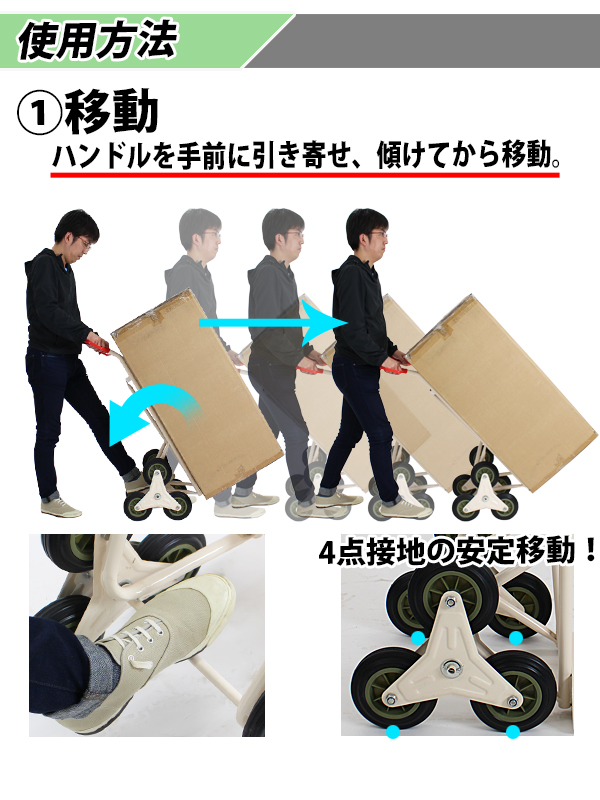 ●コンパクトで扱いやすい、スチール製の三輪階段昇降機です。 ●荷物の運搬に大活躍! ●左右3輪ずつのタイヤのうち一つが常に接地している為、段差や階段の上り下りが安定して行えます!高さ約22cm以下の段差に対応可能。 ●重量物の運搬や階段昇降時における荷物の移動に最適です。 ●段差での積載荷重は、作業者の力量に応じて適宜調整して下さい。 ※こちらの商品は、組立て式です(工具は不要です)。 ●重量:約10kg ●材質:スチール(本体)、PU(ポリウレタン)(タイヤ)、ポリプロピレン(ハンドルグリップ) ●耐荷重:約180kg |