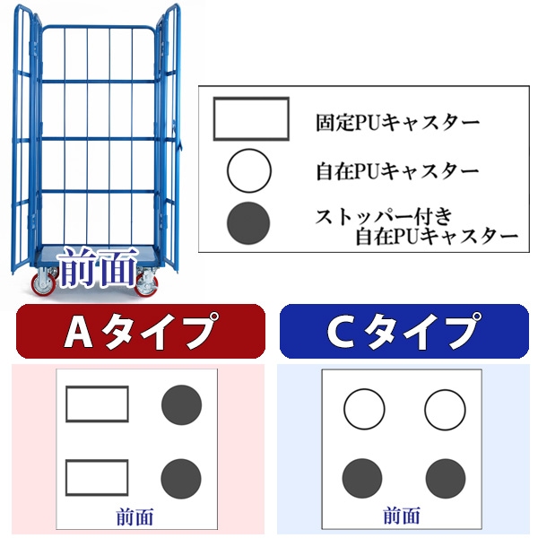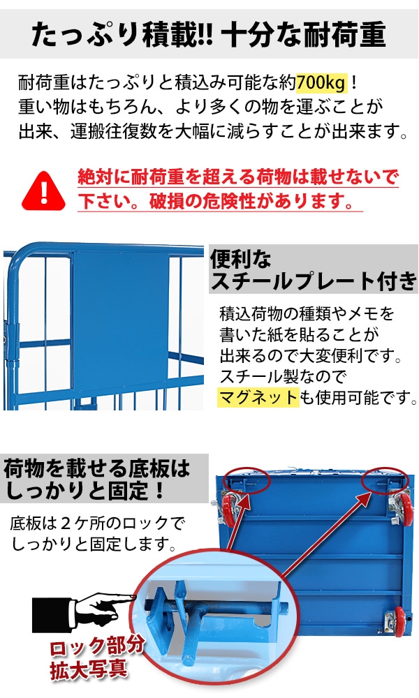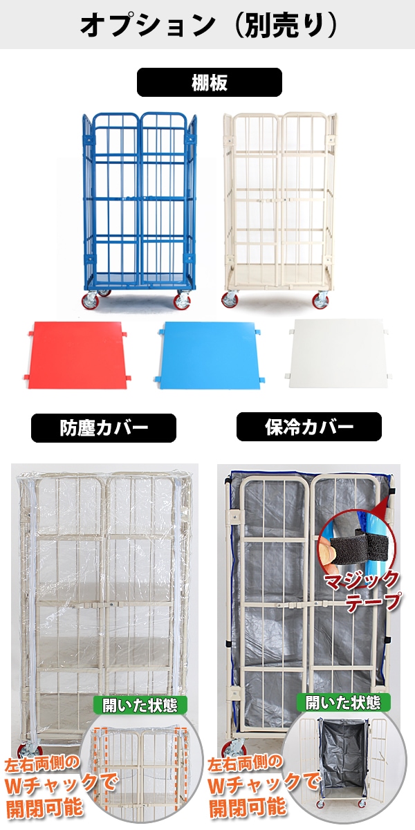 ●耐荷重性・耐磨耗性に優れたPUキャスターを使用。ゴムやプラスチックに比べて丈夫で、壊れにくく、横滑りや、床面への損傷を最小限に抑えます。 ●観音扉の中央部と下部にはロック機能を標準搭載。 扉をしっかり固定し、荷崩れを防止!万が一の落下、怪我を防ぎます。 ●広々とした倉庫内などでの使用に適しているAタイプ、狭い場所での使用に適しているCタイプをご用意。 ●両タイプともキャスターにはストッパー付き。勾配のある場所での誤作動による商品落下・破損・怪我を防止します。 ●サイズは3種類をご用意。ご使用頂ける環境に合わせてお選び下さい。 ●オプション(別売り)として、棚板、防塵カバー、保冷カバーを販売しております。 (保冷カバー使用時は棚板をご使用頂けません。) ●内寸…約89(幅)x約77(奥行)x約146(高さ)(cm) ●底板…約86(幅)x約76(奥行)(cm) ●キャスター径:約15cm ●耐荷重:約700kg ●重量:約60kg ※組立式(大人2人で組立てられます)。最初はネジを仮締めして組立て、最後にしっかりと締めるようにして下さい。 |