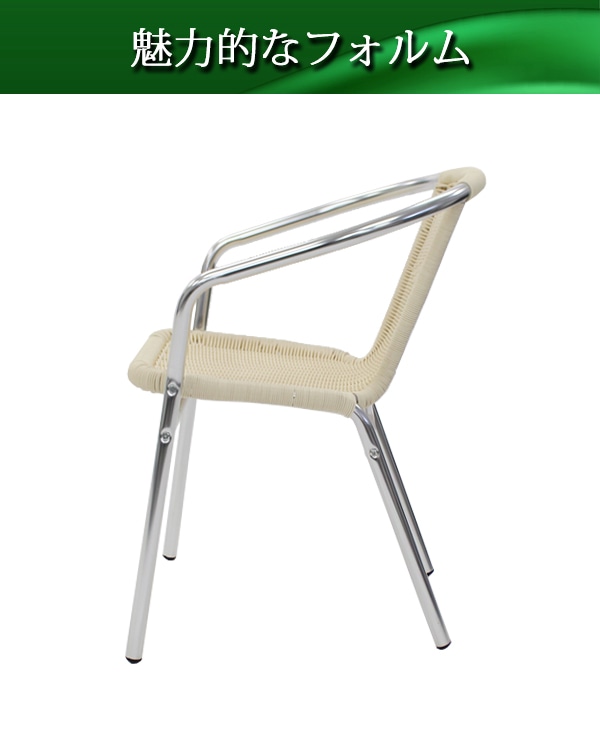 ●ガーデンチェアのご紹介です。 ●クールで都会的な表情のアルミ製のフレームと、開放的な涼しげな風を感じさせる織り込まれたシート。 ●錆びや腐食に強いアルミニウムと人工ラタン(ポリエチレン)を使用。天然ラタンと比べ、汚れが染み込む心配がないので、お手入れも簡単。デザイン性だけではなく、実用性も兼ね備えています。 ●心地よい座り心地と、美しいデザイン。機能と美の両方を兼ね備えた魅力的なフォルム。他にも、豊富なシートカラーバリエーションを販売しているので、お好きな気分に合わせてお選びできます。 ●お尻や背中に心地よくフィットする快適な座り心地。よりリラックスできる肘掛けタイプ。 ●滑り止め付きです。 ●スタッキングが可能で、収納時に場所を取らず、大変便利。 ●軽量タイプなので、女性でも軽々持ち運べます。 ●こちらのガーデンチェアは、完成品です。 ●重量:2.25kg(1脚あたりの重量) ●材質:アルミ(フレーム)、人工ラタン(ポリエチレン) ●ガーデンテーブルセットも別売りであります。 |