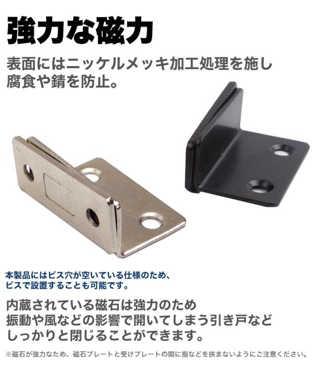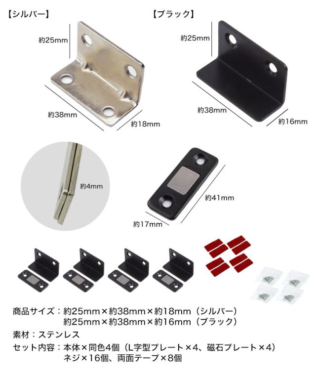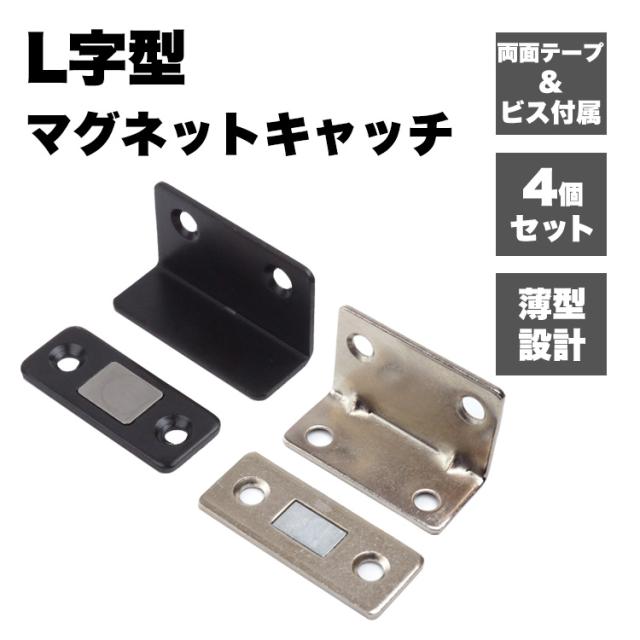 L字型 マグネットキャッチ 4個セット 磁気キャッチ ステンレス 薄型 強力 ドア止め金具 家具扉 戸棚 ドアキャッチ DIY 引き戸 両面テープ ネジ PR-LMAG4【メール便 送料無料】