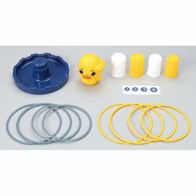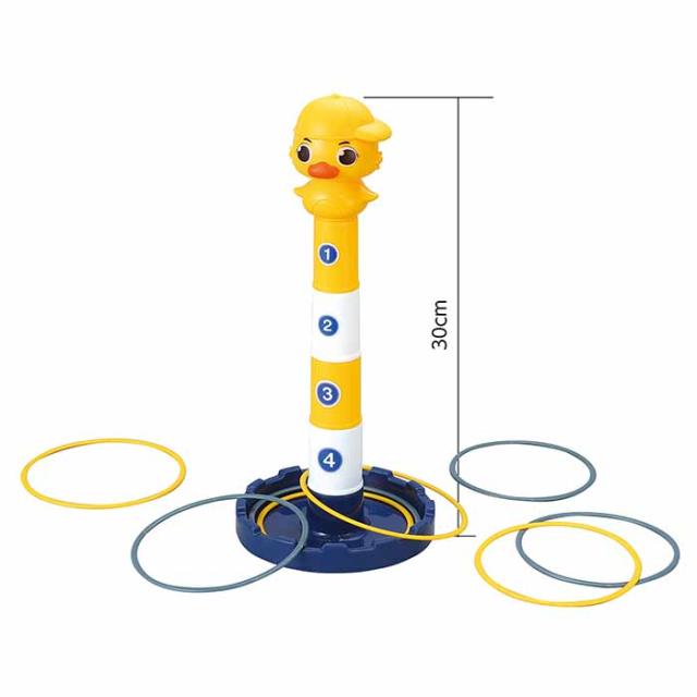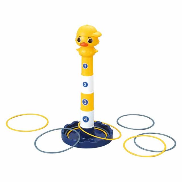 ブロックをつみたててアヒルの高さを調節できる。ブロック式で高さを変更できるあひる型のわなげ。