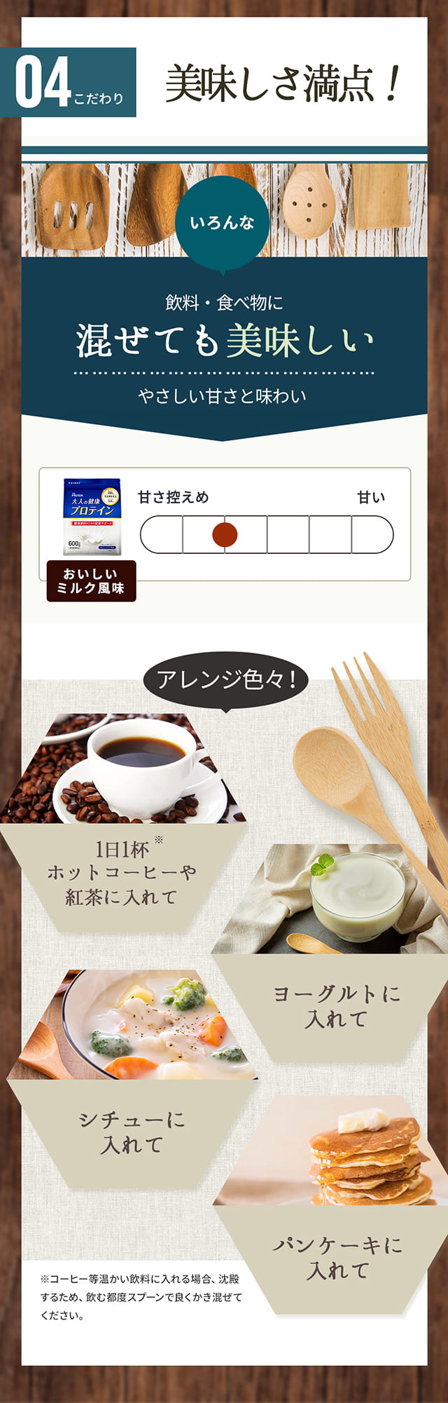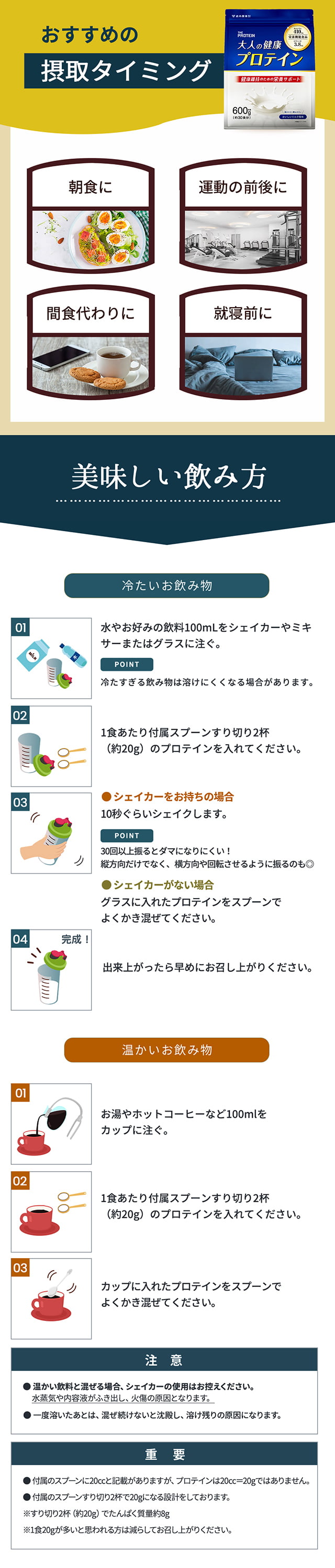 | 注意事項 | ・本品は、多量摂取により疾病が治癒したり、より健康が増進するものではなありません。1日の摂取量を守ってください。 ・あけくちや袋のはしで手を切るなどのケガをしないようにご注意ください。 ・お湯、コーヒー、牛乳または水に溶かした後は速やかにお飲みください。 ・溶かす飲み物の量は、お好みに応じて調整してください。 ・お湯、コーヒー、牛乳または水を入れてから粉を入れてください。粉を先に入れると溶け残りの原因になります。 ・お湯またはあたたかい牛乳をシェイカーに入れてシェイクしないでください。水蒸気や内容液がふき出し、やけどの原因になります。 ・体調や健康状態によっては体に合わないことがあります。その場合は摂取を中止し、医師や専門家にご相談ください。 ・開封後は水やホコリや髪の毛が入らないようにチャックをしっかりと閉め、直射日光や高温多湿の場所を避けて保存し、早めにお召し上がりください。 ・濡れたスプーンを袋の中に入れないでください。 ・製品中に色の濃い粒が見えることがあります。これは原料の一部で品質には問題ありません。 ・妊娠、授乳中およびお薬を服用中の方は、医師とご相談の上ご利用ください。 ・本製品製造工場では、小麦、乳成分、卵、落花生、えび、いか、牛肉、さけ、さば、大豆、鶏肉、豚肉、やまいも、りんご、バナナ、くるみ、ごま、アーモンド、ゼラチン、魚介類を含む製品を生産しております。 |