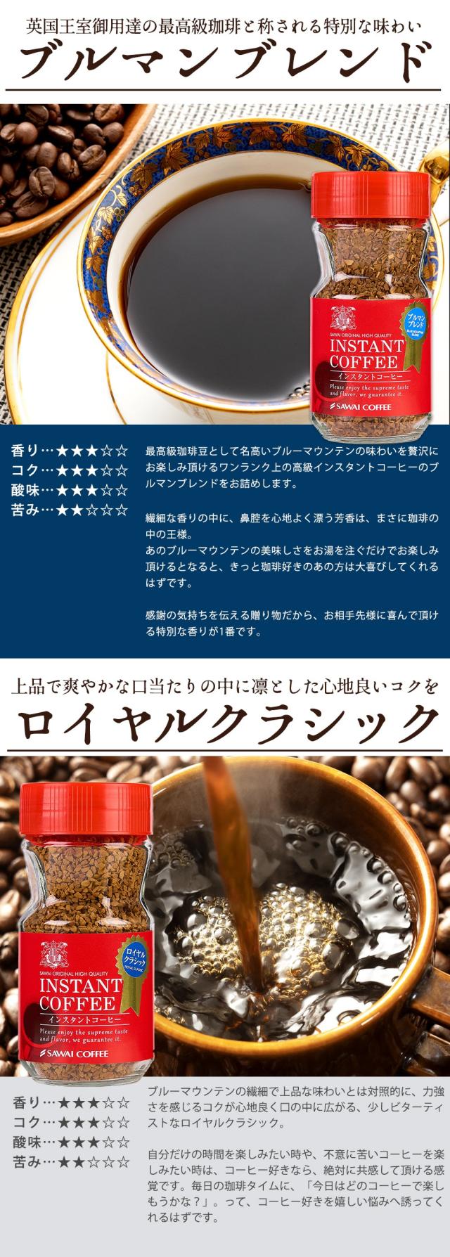 | 内容量 | 特選インスタントコーヒー ブルマンブレンド 80g 特選インスタントコーヒー ロイヤルクラシック 80g 特選インスタントコーヒー モカブレンド 80g |