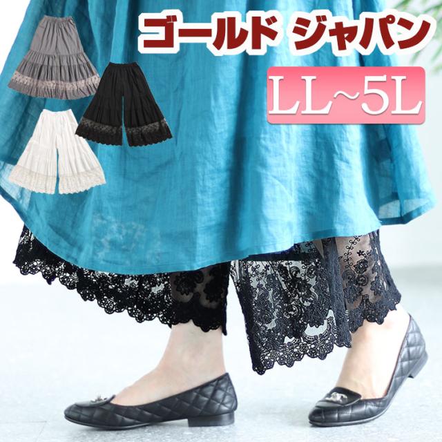 冬新作 大きいサイズ レディース ボトムス パンツ 刺繍レースコットンティアードペチパンツ ペチコート インナー コットン 綿 ワイド 刺繍 レース ウエストゴム ティアード ロング シアー 春 夏服 F フリー LL 2L 3L 4L 5L ホワイト 白 ブラック 黒 グレー ゴールドジャパン