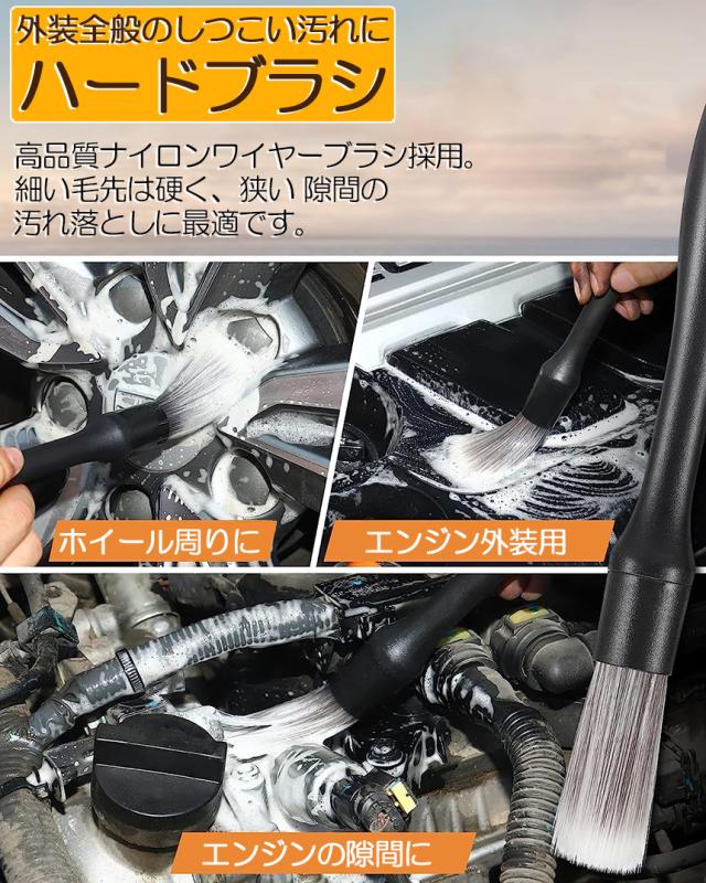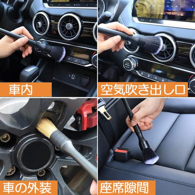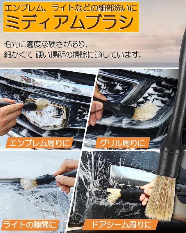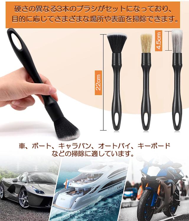 【使いやすい3種類セット】ディテールブラシは硬さの異なる3本セットで様々なシーンでお使いいただけます。車内の掃除だけでなく、車体、ホイール、掃除が難しい隙間の掃除にも使用できます。【柔らかい素材の高級ソフトブラシ】: 高級PBT素材を使用しており、高密度でとても柔らかい素材の洗車ブラシです。大切な車体に傷をつけずにご使用いただけます。主にエアコンの出口、ハンドルの隙間、シートの隙間、革の表面などに使用されます。