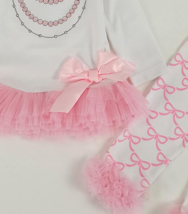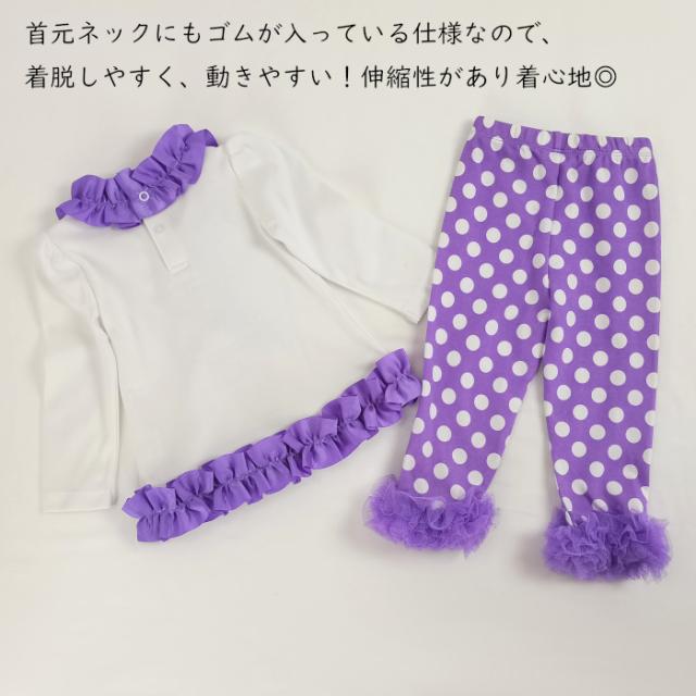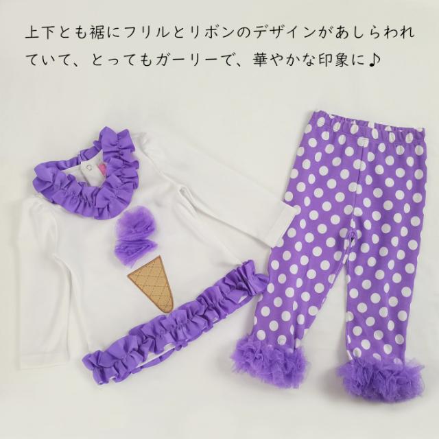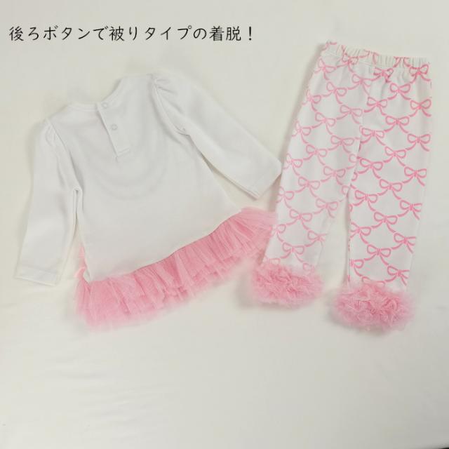 上下とも裾にフリルとリボンのデザインがあしらわれていて、とってもガーリーで、華やかな印象に