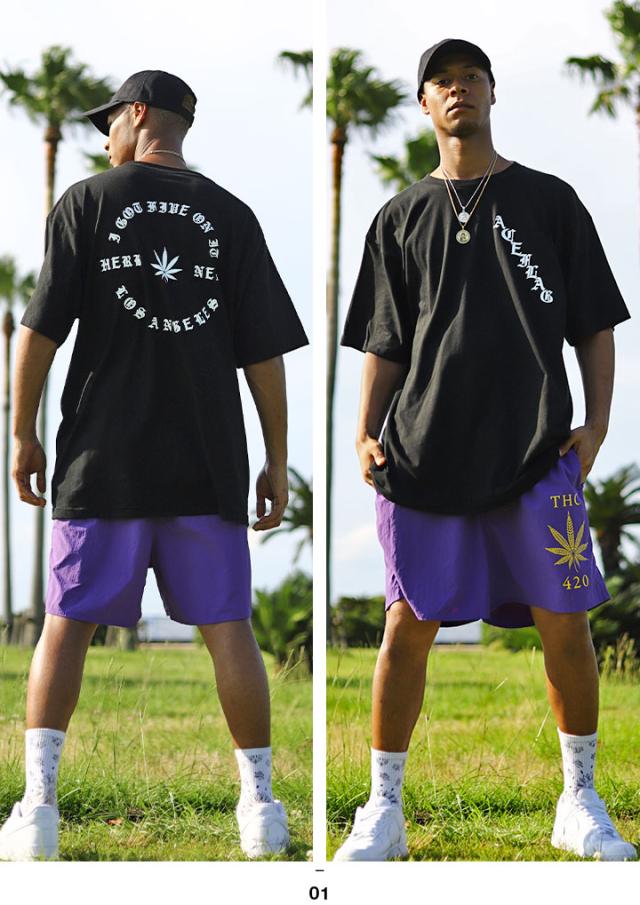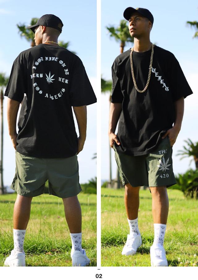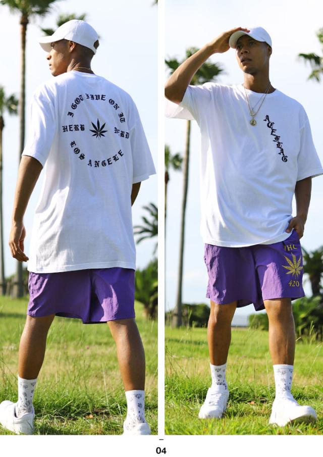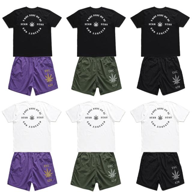 ヘンプロゴと共に、ウェッサイを代表するhiphopのリリックをドロップしたTシャツと麻の葉に関するスラングや隠語を冠したナイロンハーフパンツの上下セット。