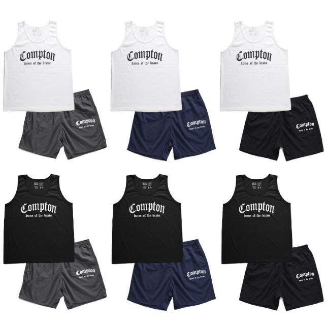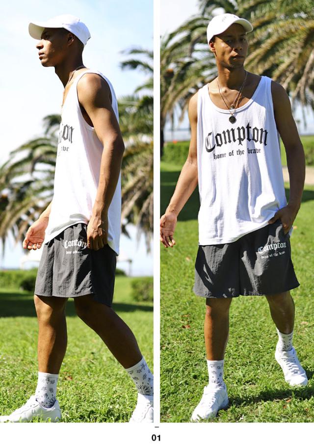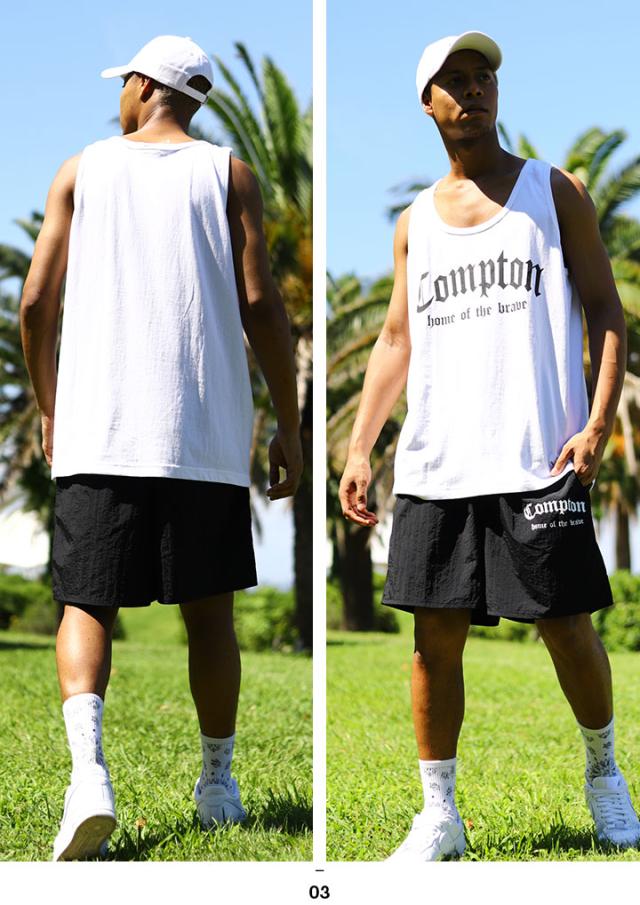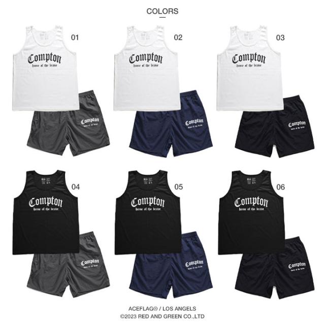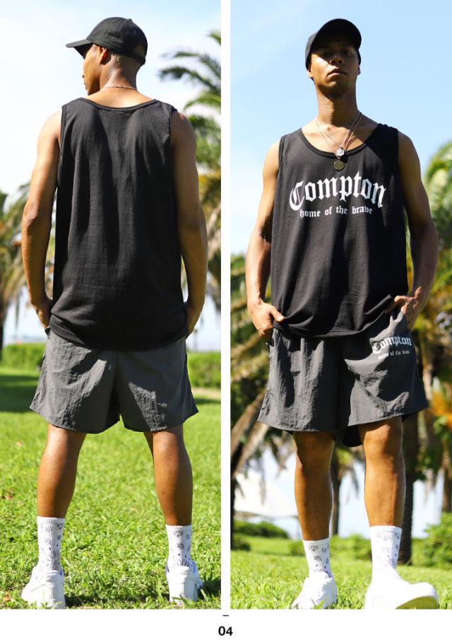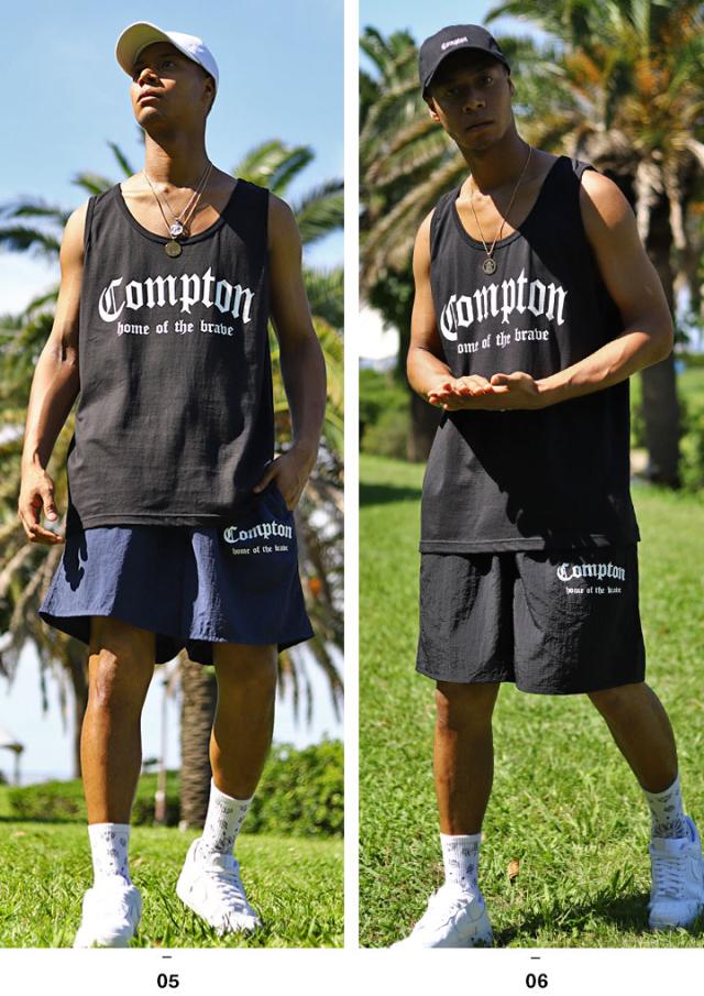 N.W.A.を輩出し、Straight Outta Comptonの舞台としても知られている「Compton」をドロップしたタンクトップとナイロンハーフパンツの上下セット。